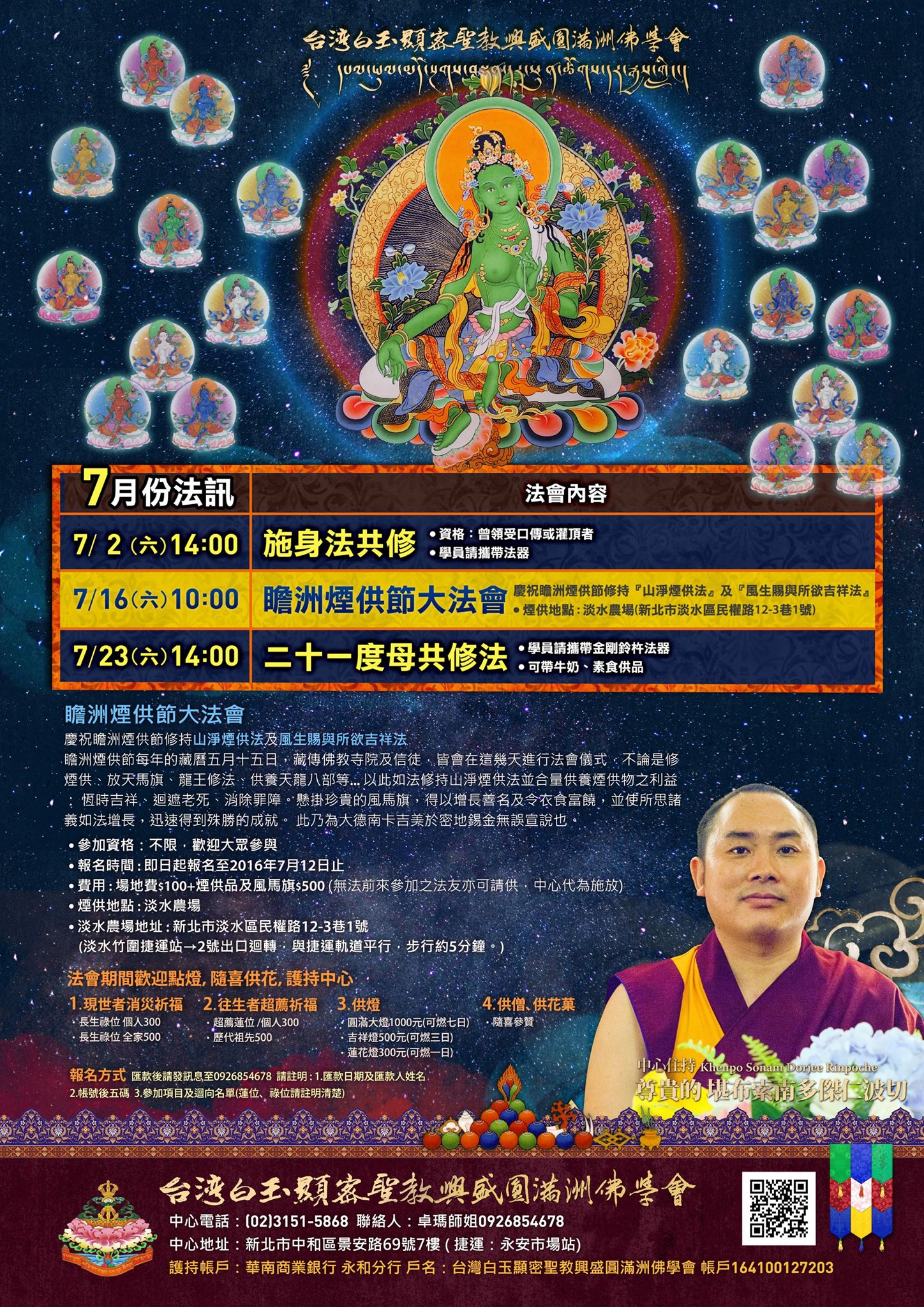 7/16(六) 10:00 【瞻洲煙供節大法會】 慶祝瞻洲煙供節修持『山淨煙供法』及『風生賜與所欲吉祥法』 瞻洲煙供節每年的藏曆五月十五日,藏傳佛教寺院及信徒,皆會在這幾天進行法會儀式,不論是修煙供、放天馬旗、龍王修法、供養天龍八部等 …。 以此如法修持山淨煙供法並合量供養煙供物之利益: 恆時吉祥、迴遮老