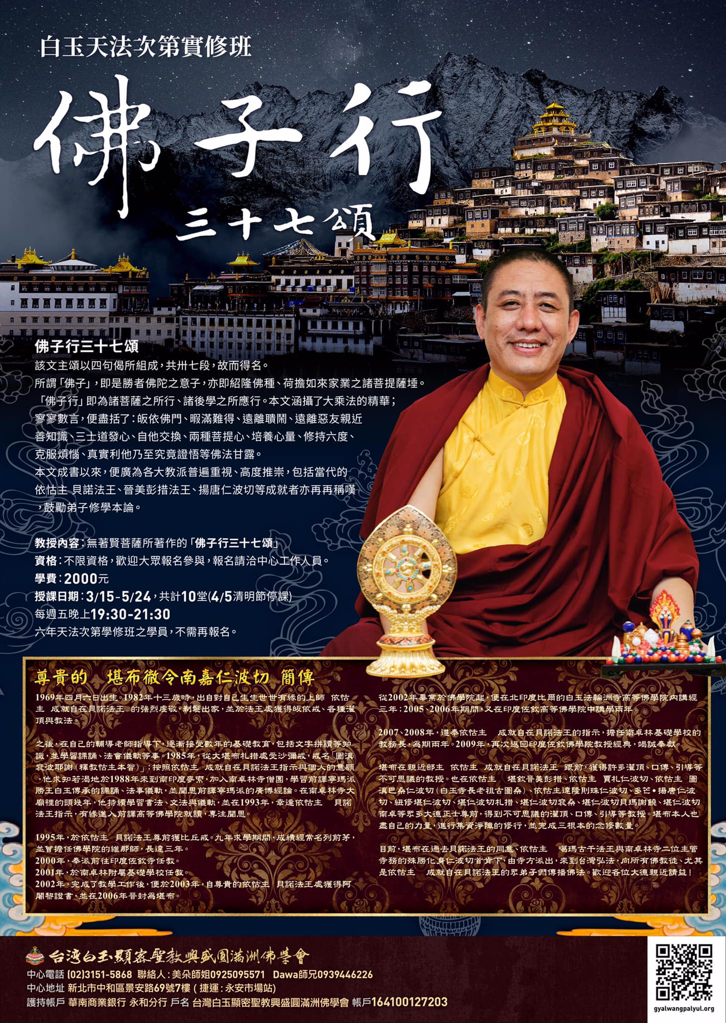 —— 佛子行三十七頌 —— ▪️教授內容:無著賢菩薩所著作的「佛子行三十七頌」 ▪️學費:2000元 ▪️授課日期: 3/15-5/24,共計10堂 (4/5清明節停課) 每週五晚上19:30~21:30 ▪️六年天法次第學修班之學員, 不需再報名。 【《佛子行卅七頌》】 無著賢菩薩,藏名「悟曲扥美桑波」,1