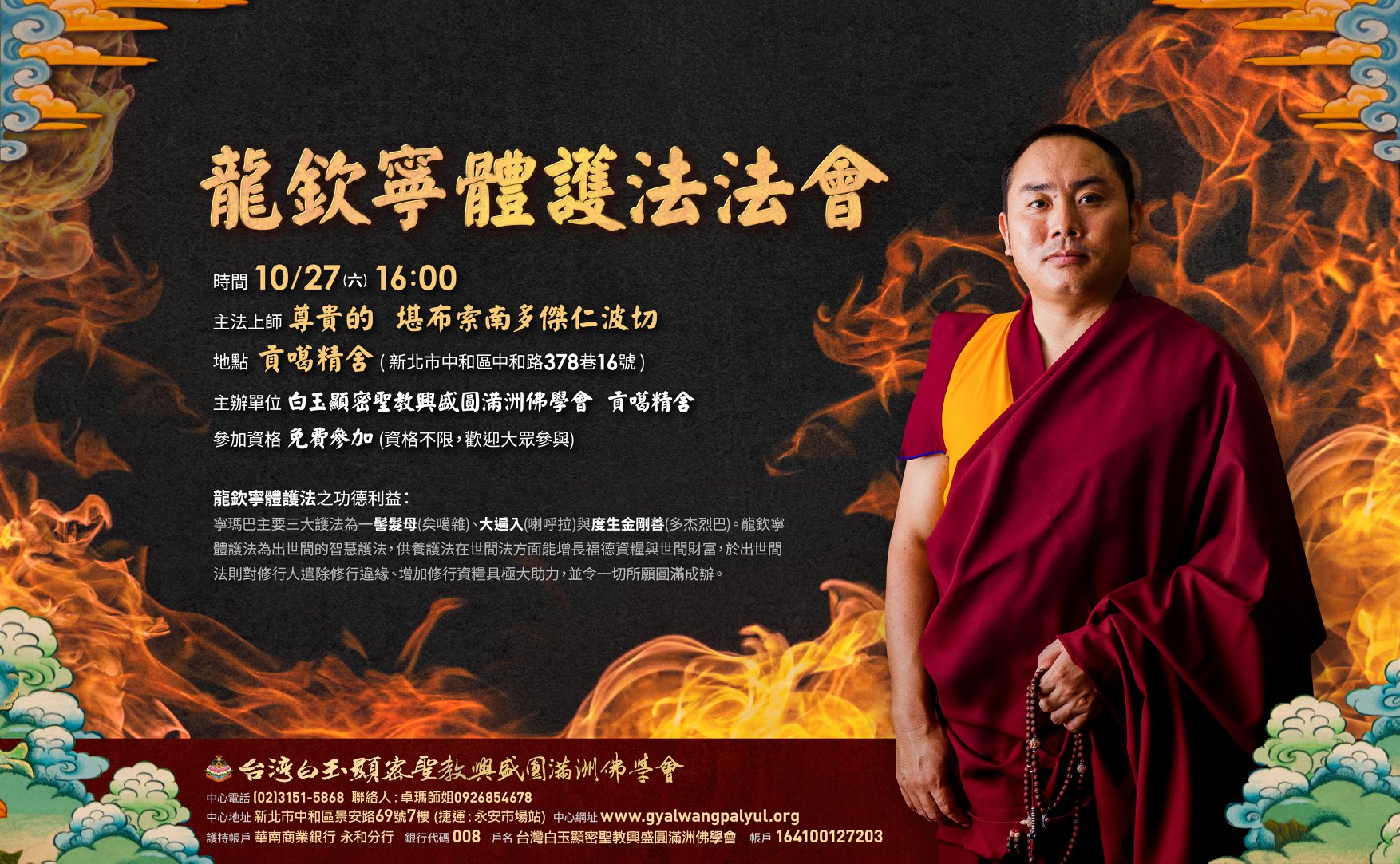 《 法 訊 通 知 》 【龍欽寧體護法法會】 ▪️時間:10/27週六 ➡️4:00pm ▪️主法上師:尊貴的 堪布索南多傑仁波切 ▪️法會地點:貢噶精舍 新北市中和區中和路378巷16號 ( 捷運永安市場站 ) ▪️主辦單位: 白玉顯密聖教興盛圓滿洲 佛學會 貢噶精舍 ▪️參加資格:免費參加,資格不