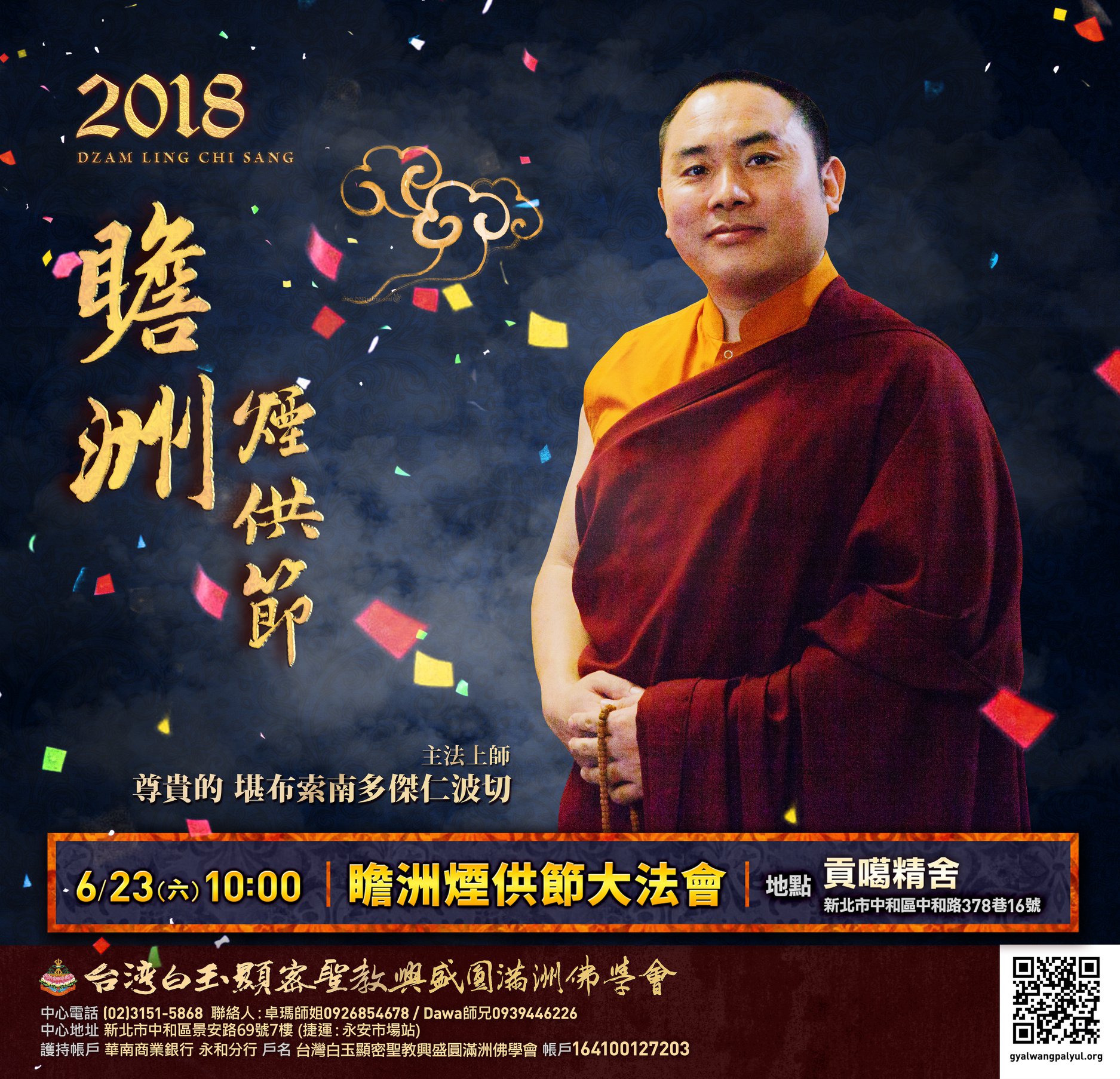 【瞻洲煙供節大法會】 ▪️主題:瞻洲煙供節大法會 ▪️法會時間:6/23(六) 早上10:00-12:00 ▪️主法上師:尊貴的 堪布索南多傑仁波切 ▪️法會地點:貢噶精舍 / 新北市中和區中和路378巷16號 ( 捷運永安市場站 ) ▪️參加費用:煙供品及風馬旗$500 / 每人 ( 無法前來參加之法友亦可