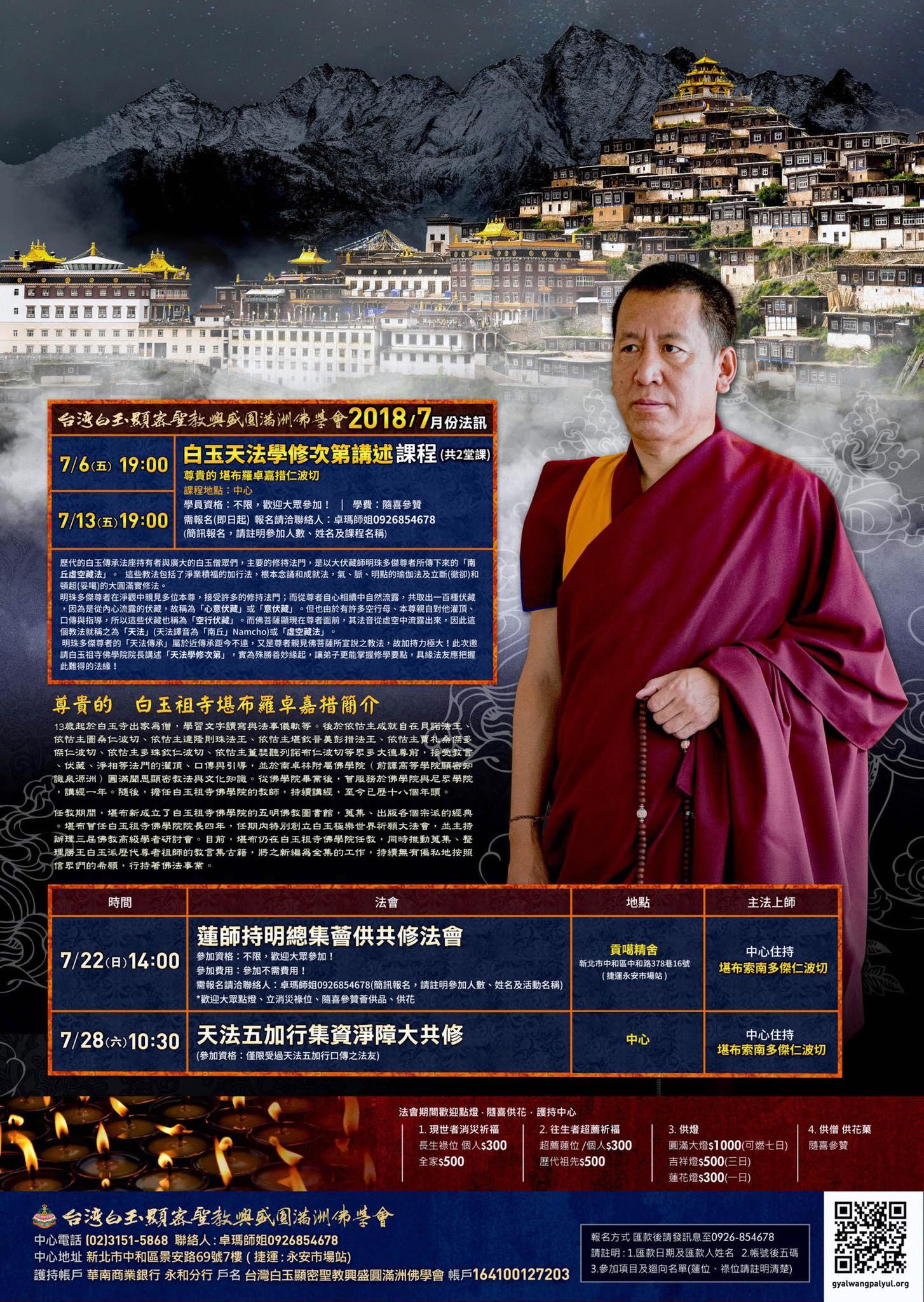【 2018年七月法訊通告 】 ▪️主題:「白玉天法學修次第講述」課程 ▪️課程時間: *7/6(五)、7/13(五)晚上7:00~9:30 *共2堂課 ▪️主講上師: 西藏白玉祖寺- 尊貴的 堪布羅卓嘉措 ▪️課程地點:中心 ▪️學費:隨喜參贊 ▪️學員資格:不限,歡迎大眾參加! ▪️需報名~即日起 請洽聯