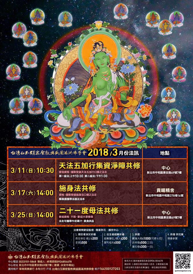 台灣白玉顯密聖教興盛圓滿洲佛學會 2018年5-6月法訊 5/26(六) 下午2:00 【二十一度母共修】 ・法會地點:中心 ・參加資格:不限,歡迎大眾參與 ・法友可攜帶牛奶果汁,素食供品 6/8(五) 19:00-21:00 【天法五加行 – 上師相應法】進階課程➀ ・課程地點:中心 ・費用:隨喜參贊 ・資